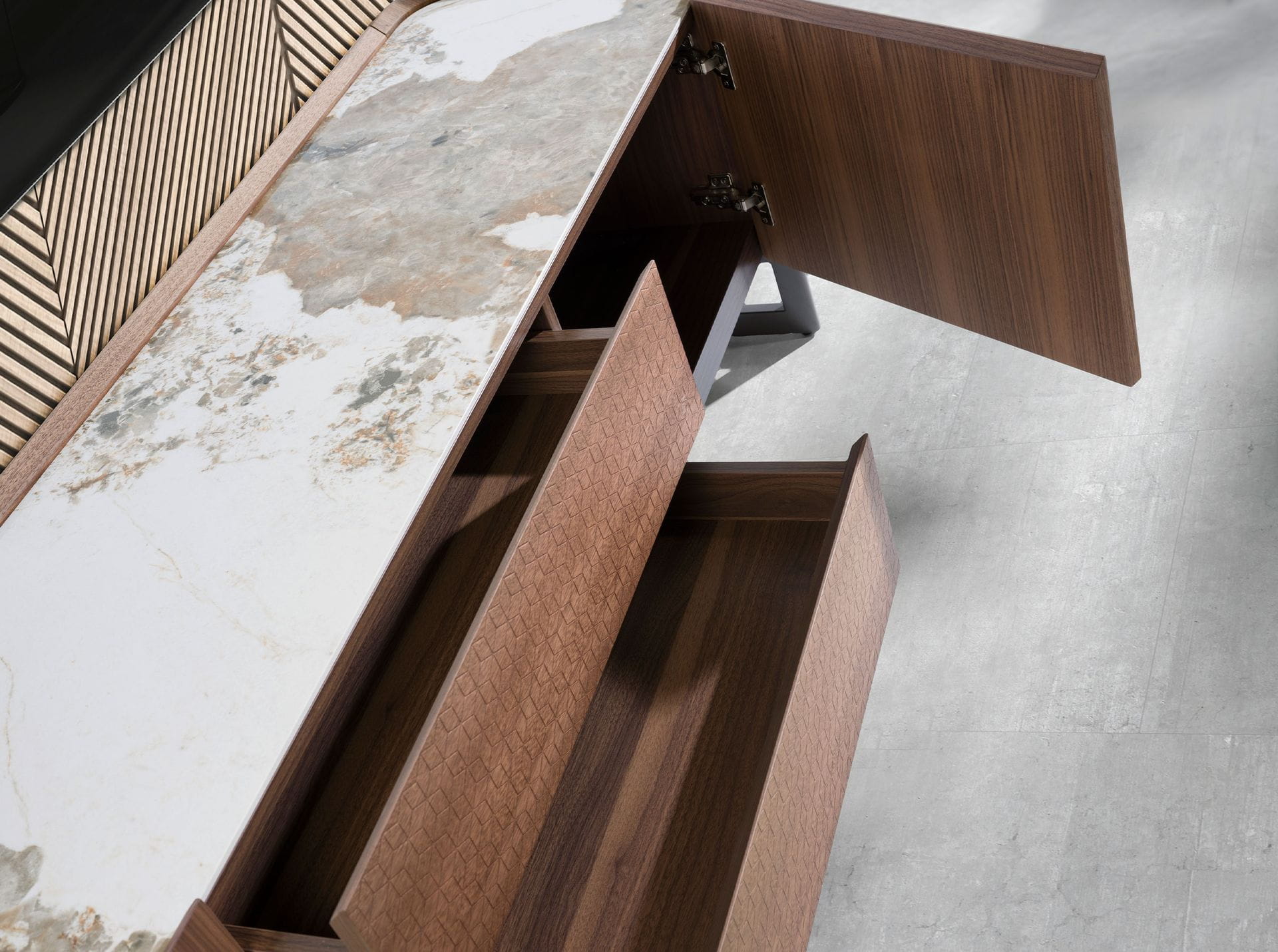 Materiał: drewno fornirowane naturalnym orzechem, porcelana imitujaca marmur