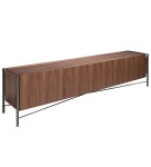 Nowoczesna szafka RTV z naturalną strukturą drewna fornirowanego orzechem i oryginalnymi nogami ze stali nierdzewnej. Posiada dużą przestrzeń do przechowywania