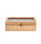 Piękne i dekoracyjne pudełko na biżuterię wykonane z rattanu ze szklaną pokrywką. Podzielone na 7 małych przegródek obszytych miękkim aksamitem