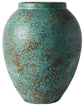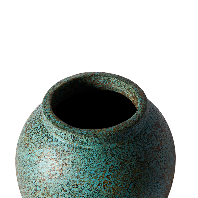 Ten wazon przyciąga wzrok nie tylko swoim kształtem, ale przede wszystkim unikalnym wykończeniem. Powierzchnia pokryta jest warstwą szkliwa o nieregularnej strukturze i zróżnicowanej kolorystyce – dominuje turkus z akcentami rdzawej czerwieni, przywołując skojarzenia z naturalną patyną metalu lub śladami czasu odciśniętymi na ceramice. To przedmiot, który doskonale odnajdzie się zarówno w surowym wnętrzu loftowym, jak i w przestrzeni inspirowanej estetyką wabi-sabi. Może pełnić funkcję samodzielnego akcentu dekoracyjnego lub dopełniać kompozycję z suszonymi gałęziami, trawami czy minimalistycznymi bukietami. Wazon emanuje spokojem, trwałością i szlachetnym niedopowiedzeniem. Jest przedmiotem, który się nie narzuca, ale buduje charakter wnętrza.