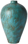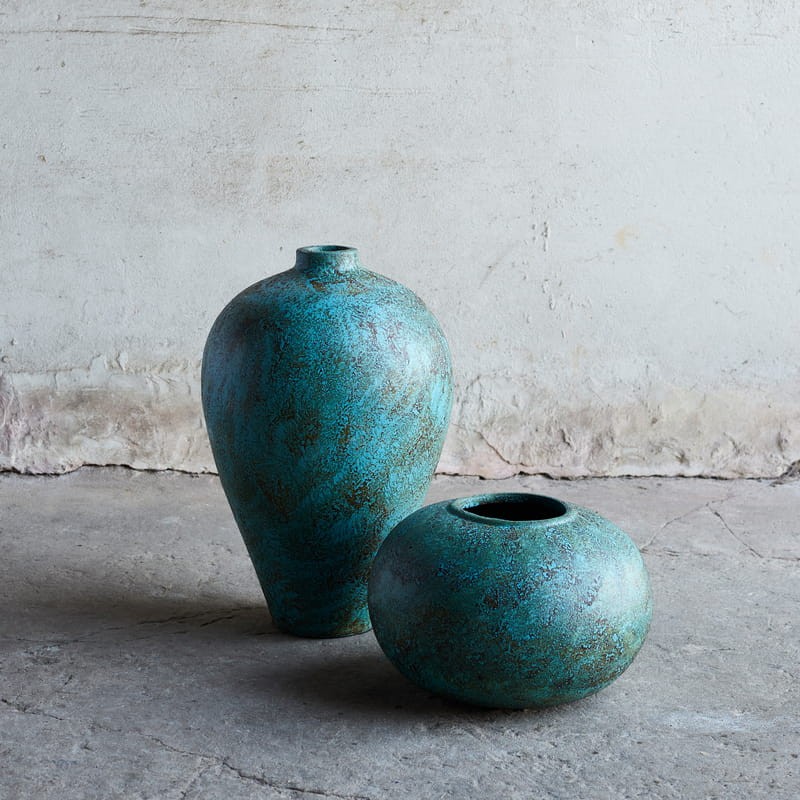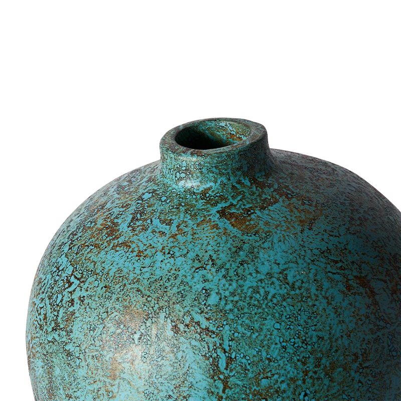 Ten wazon przyciąga wzrok nie tylko swoim kształtem, ale przede wszystkim unikalnym wykończeniem. Powierzchnia pokryta jest warstwą szkliwa o nieregularnej strukturze i zróżnicowanej kolorystyce – dominuje turkus z akcentami rdzawej czerwieni, przywołując skojarzenia z naturalną patyną metalu lub śladami czasu odciśniętymi na ceramice. To przedmiot, który doskonale odnajdzie się zarówno w surowym wnętrzu loftowym, jak i w przestrzeni inspirowanej estetyką wabi-sabi. Może pełnić funkcję samodzielnego akcentu dekoracyjnego lub dopełniać kompozycję z suszonymi gałęziami, trawami czy minimalistycznymi bukietami. Wazon emanuje spokojem, trwałością i szlachetnym niedopowiedzeniem. Jest przedmiotem, który się nie narzuca, ale buduje charakter wnętrza.