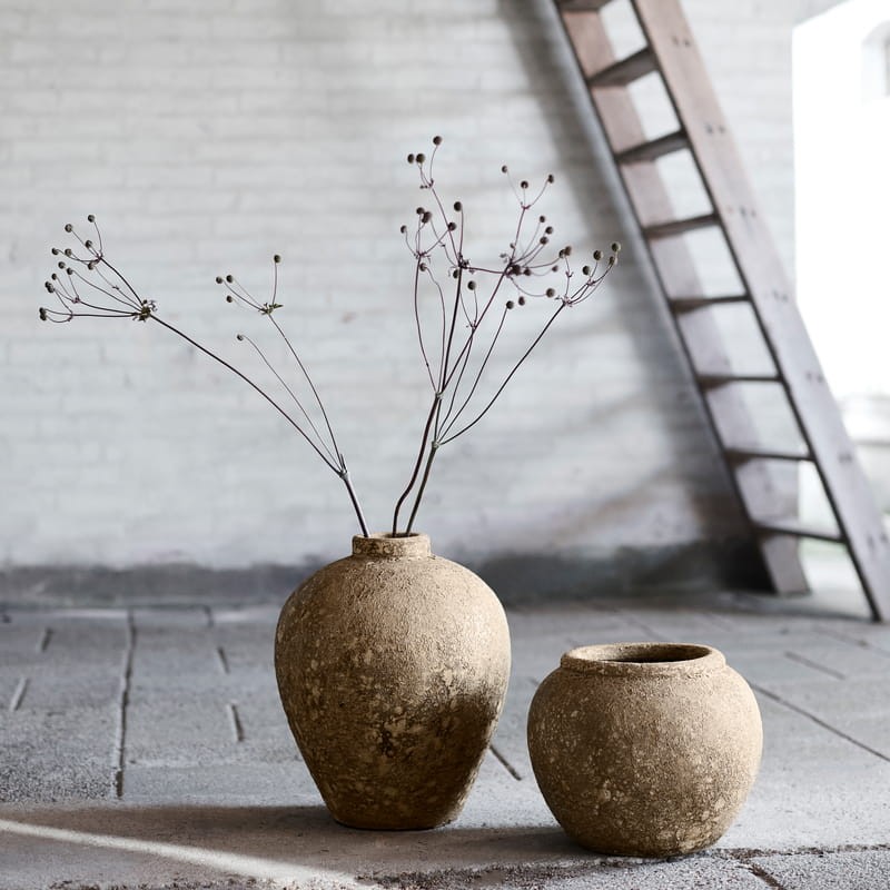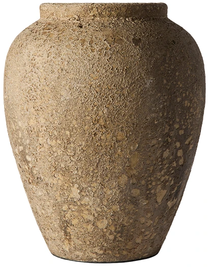 Ten wazon zachwyca swoją kamienną fakturą i organicznym wykończeniem, które przywodzi na myśl znaleziska archeologiczne lub naturalnie uformowane skały. Jego nieregularna, szorstka powierzchnia w odcieniach brązu sprawia wrażenie, jakby była efektem działania czasu i żywiołów, a nie współczesnego rzemiosła. Kształt naczynia nawiązuje do klasycznych amfor, ale pozbawiony jest jakiejkolwiek dekoracyjności – to forma czysta, pierwotna i pełna spokoju. Dzięki neutralnej kolorystyce wazon łatwo wpisuje się w różne stylistyki wnętrz – od minimalistycznych i skandynawskich po rustykalne czy wabi-sabi. To przedmiot, który działa subtelnie, ale z wyraźną obecnością. Idealny jako pojedynczy akcent na podłodze, komodzie lub w przestrzeni ekspozycyjnej.