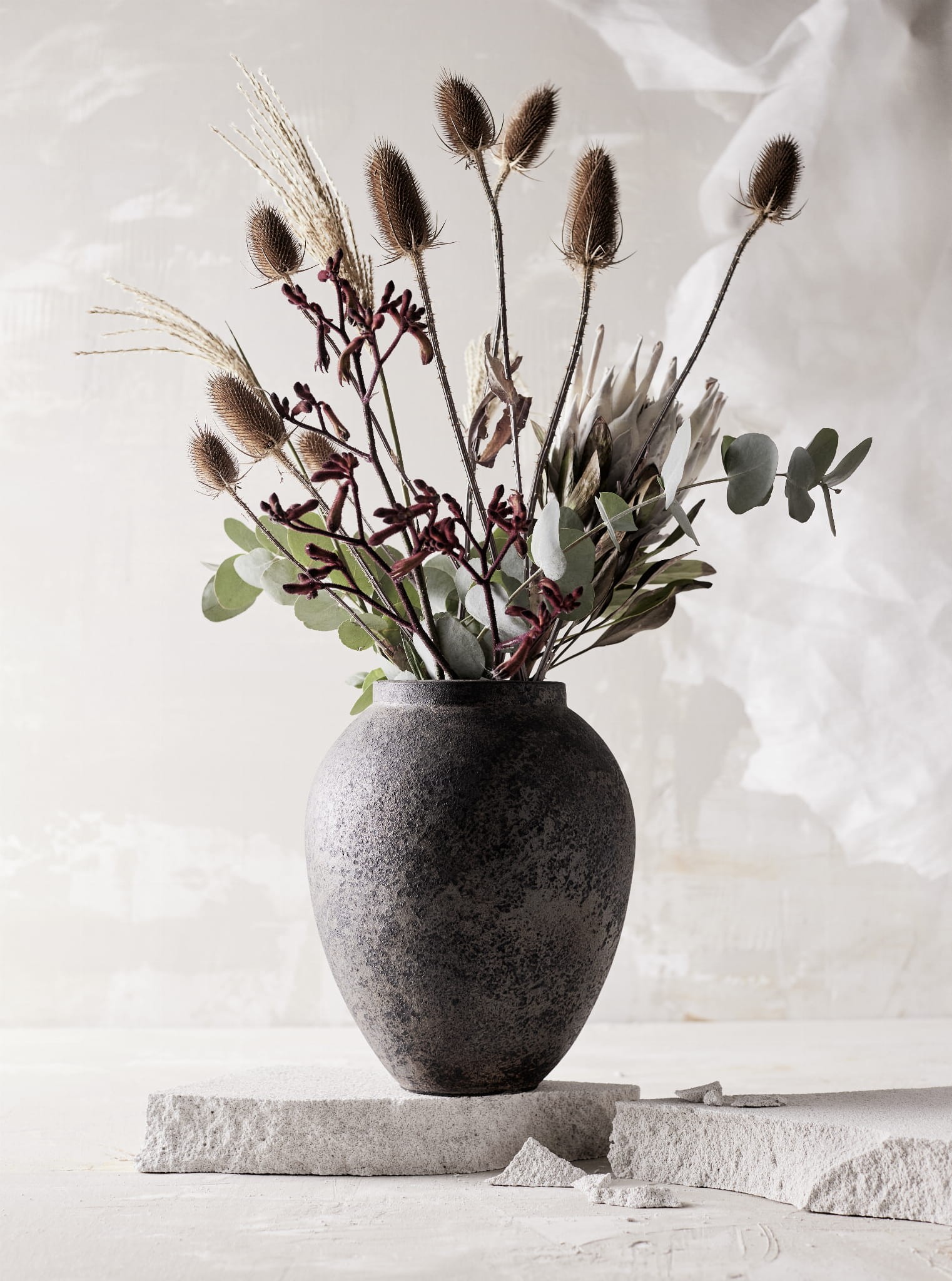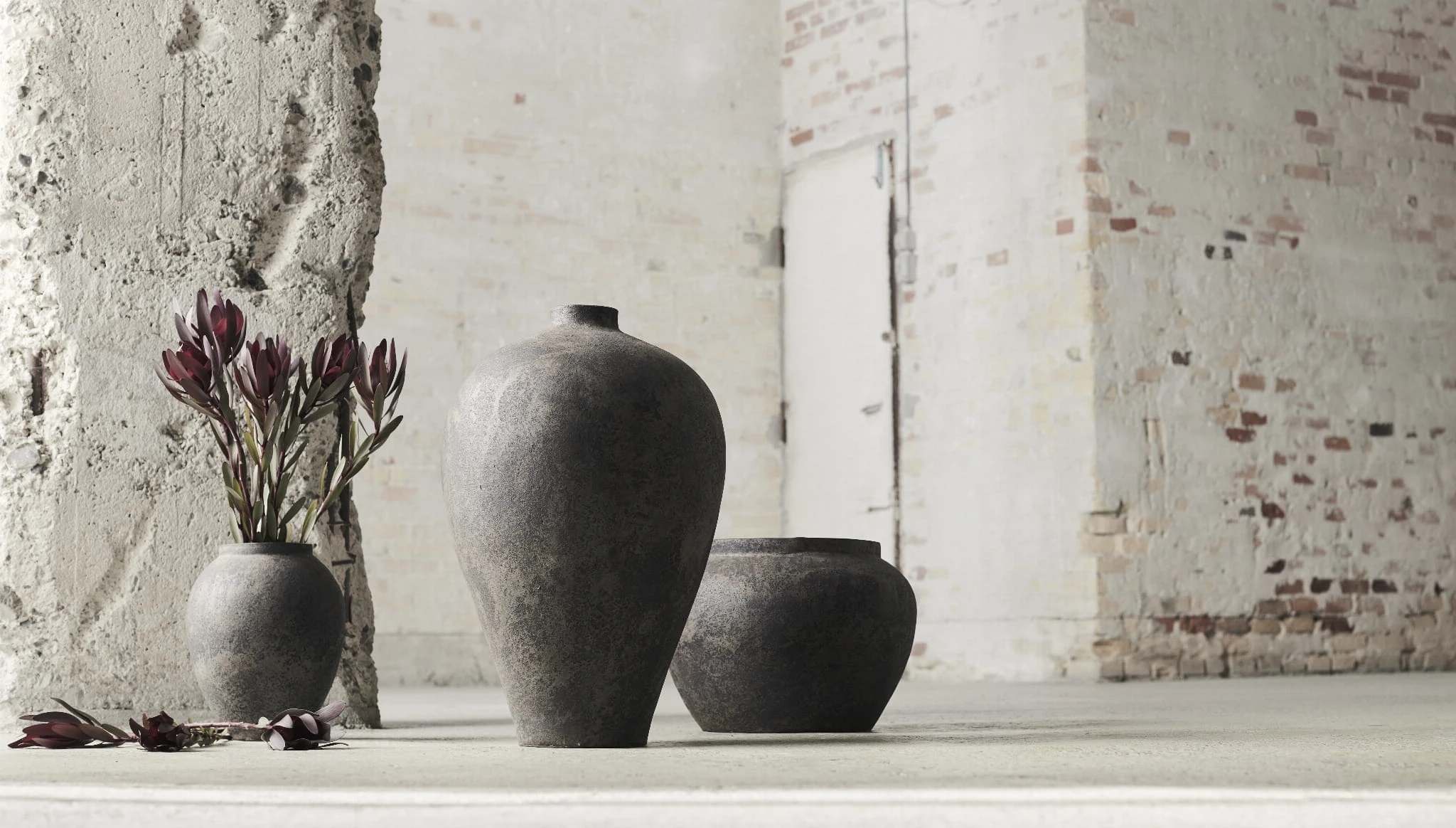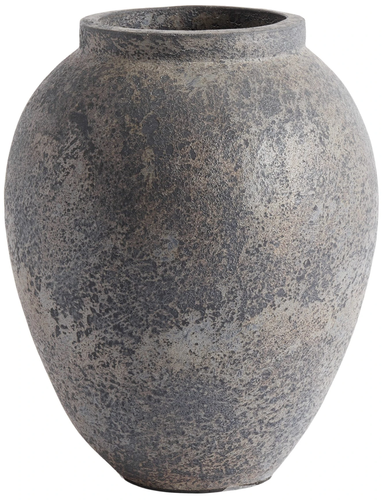 Ta wysoka waza zachwyca szlachetną prostotą formy i wyrazistą, mineralną powierzchnią. Jej tekstura przypomina wypłukany kamień lub ceramikę noszącą ślady czasu – z nieregularnymi przebarwieniami, matowymi wykończeniami i delikatnymi różnicami tonalnymi, w których mieszają się chłodne szarości, brunatne akcenty i przygaszony grafit. Klasyczny, lekko stożkowy kształt nadaje jej ponadczasowości, ale to właśnie powierzchnia przyciąga wzrok – organiczna, niedoskonała, pełna charakteru. Waza świetnie prezentuje się solo, jako surowy obiekt dekoracyjny, ale równie dobrze odnajdzie się w duecie z niższym modelem z tej samej kolekcji. To propozycja dla osób, które cenią naturalne materiały, subtelność i cichą siłę przedmiotów zakorzenionych w rzemiośle.