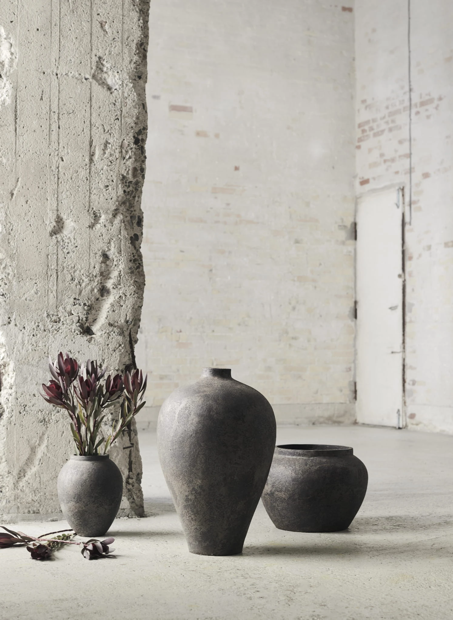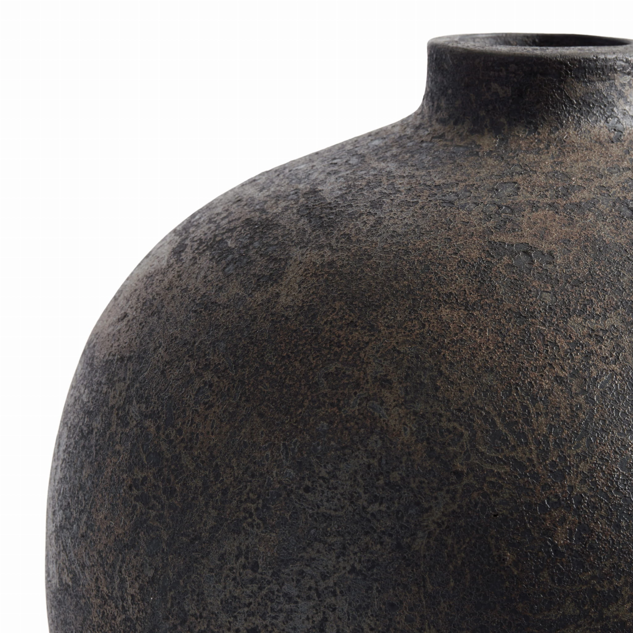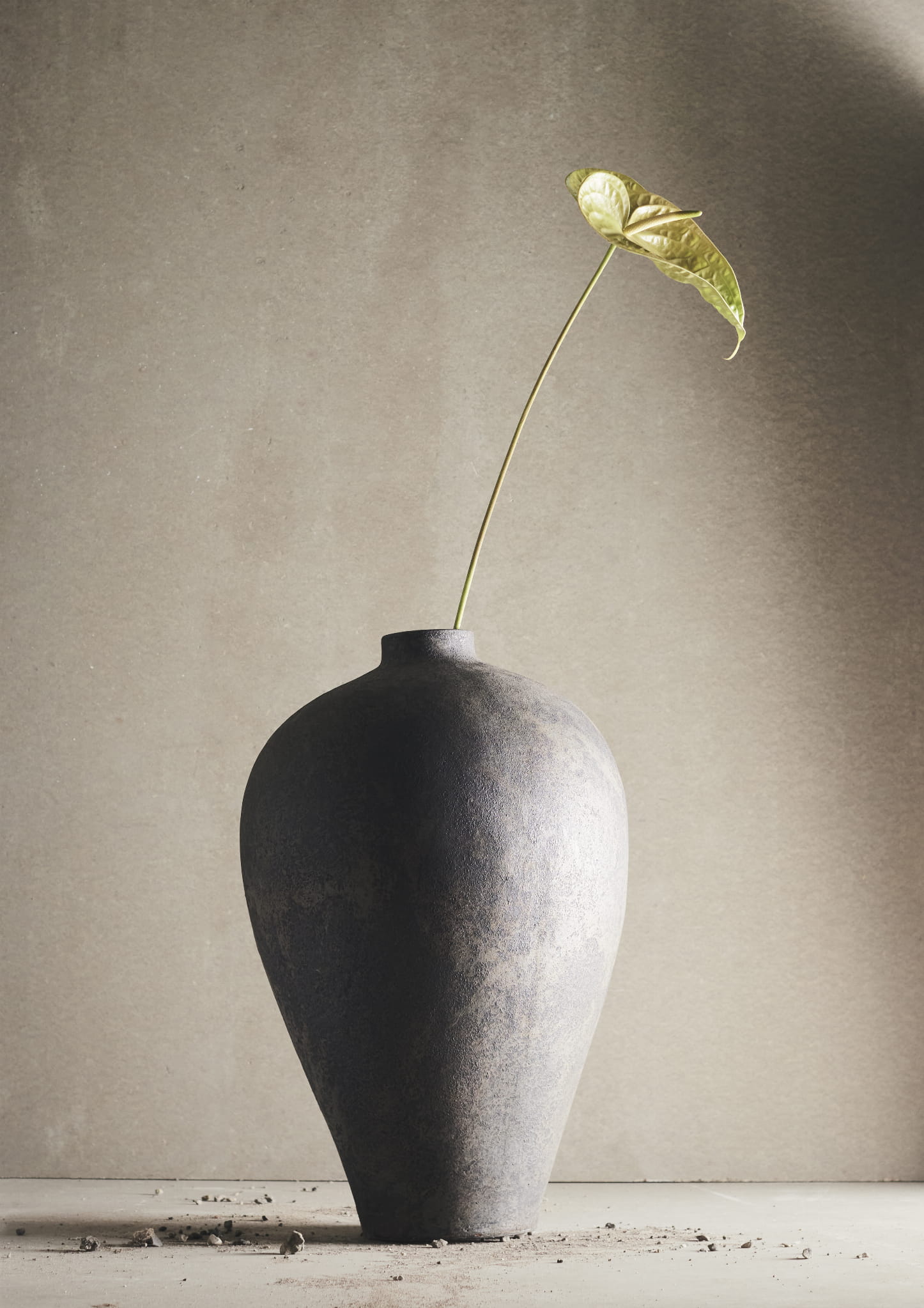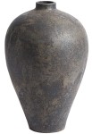 Ta wysoka waza zachwyca szlachetną prostotą formy i wyrazistą, mineralną powierzchnią. Jej tekstura przypomina wypłukany kamień lub ceramikę noszącą ślady czasu – z nieregularnymi przebarwieniami, matowymi wykończeniami i delikatnymi różnicami tonalnymi, w których mieszają się chłodne szarości, brunatne akcenty i przygaszony grafit. Klasyczny, lekko stożkowy kształt nadaje jej ponadczasowości, ale to właśnie powierzchnia przyciąga wzrok – organiczna, niedoskonała, pełna charakteru. Waza świetnie prezentuje się solo, jako surowy obiekt dekoracyjny, ale równie dobrze odnajdzie się w duecie z niższym modelem z tej samej kolekcji. To propozycja dla osób, które cenią naturalne materiały, subtelność i cichą siłę przedmiotów zakorzenionych w rzemiośle.