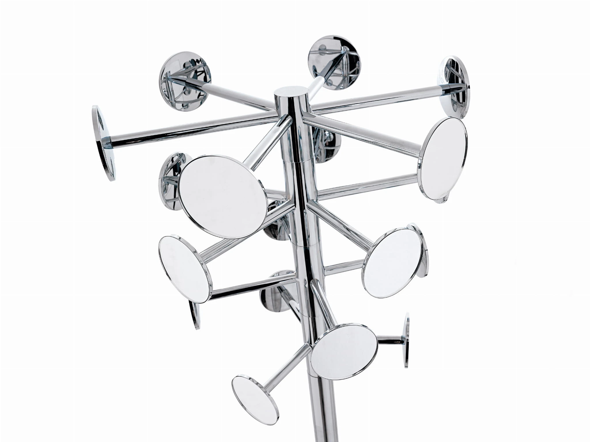 Ten wieszak przyciąga uwagę kompozycją symetrycznie rozmieszczonych, okrągłych haczyków, które niczym małe reflektory otaczają smukły, metalowy trzon. Jego konstrukcja jest prosta, ale wyrazista — elegancki połysk podkreśla czystą linię formy, a okrągła podstawa nadaje całości stabilności i lekkości jednocześnie. To praktyczny element wyposażenia, który dzięki swojej architektonicznej precyzji staje się subtelną rzeźbą we wnętrzu. Idealny do przestrzeni uporządkowanych, nowoczesnych, w których funkcja i forma idą w parze, tworząc harmonijną całość.