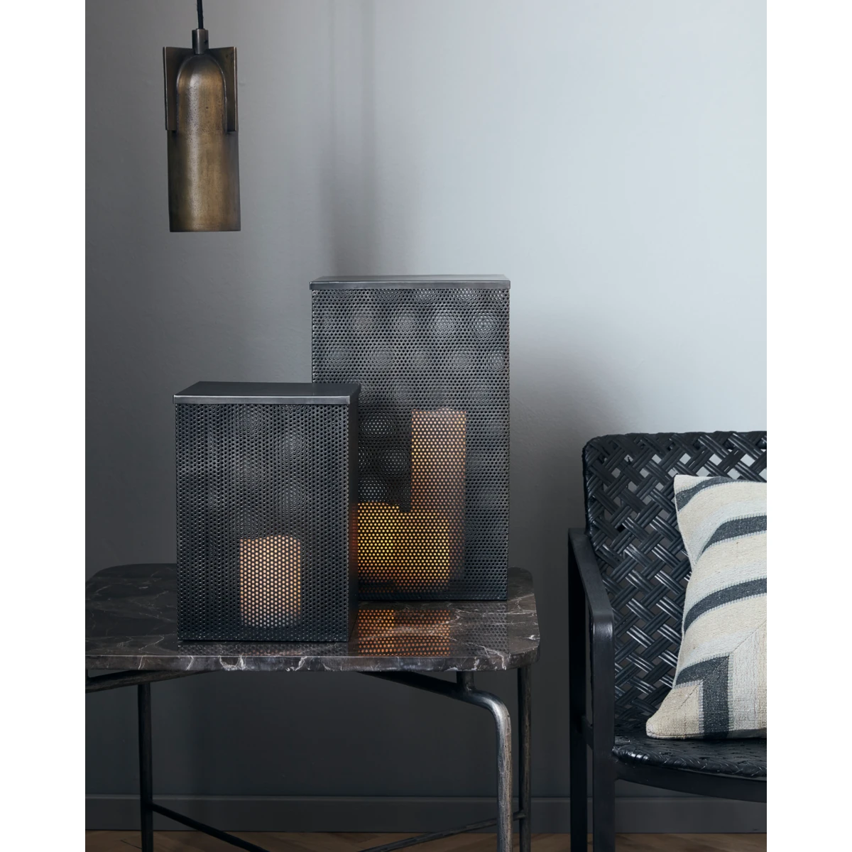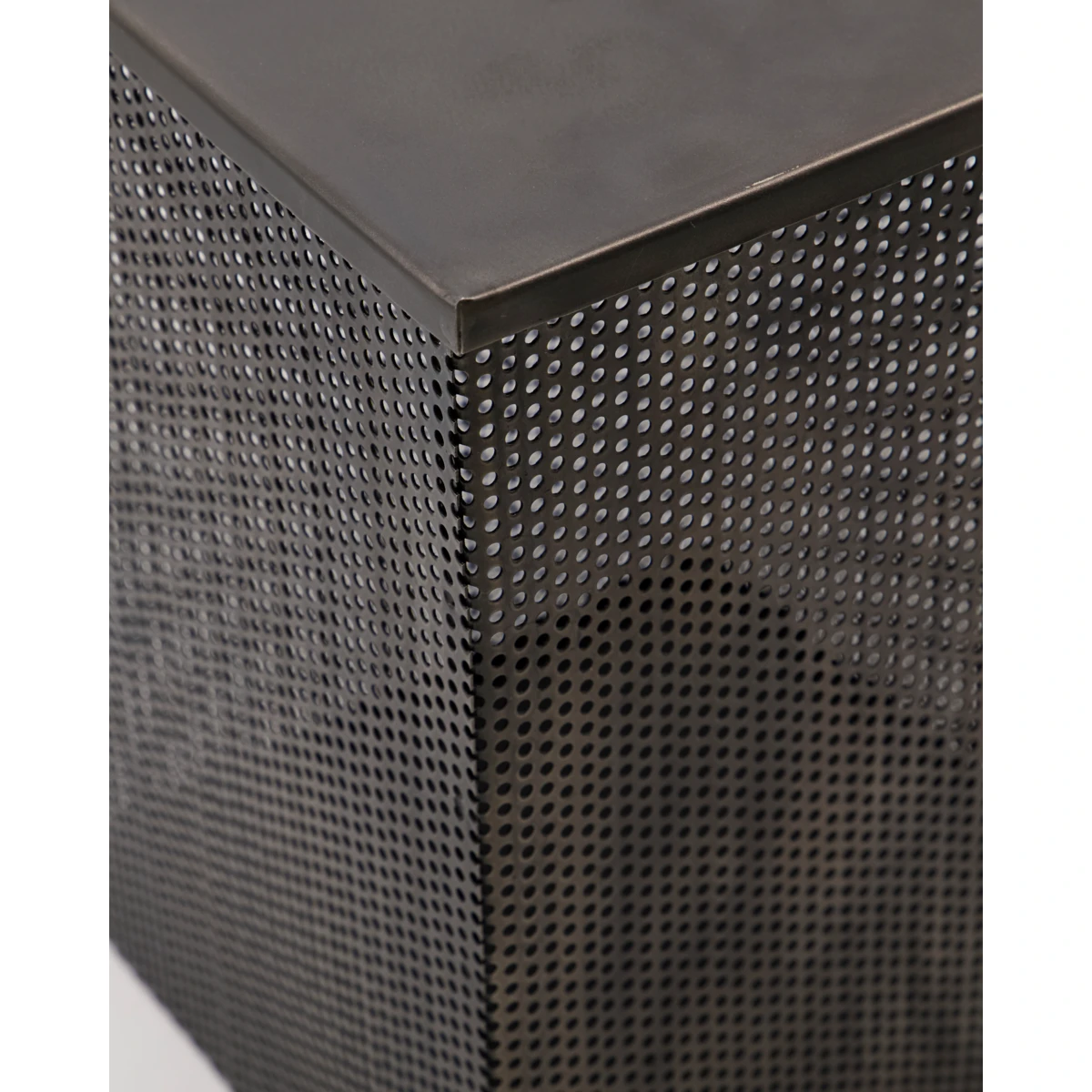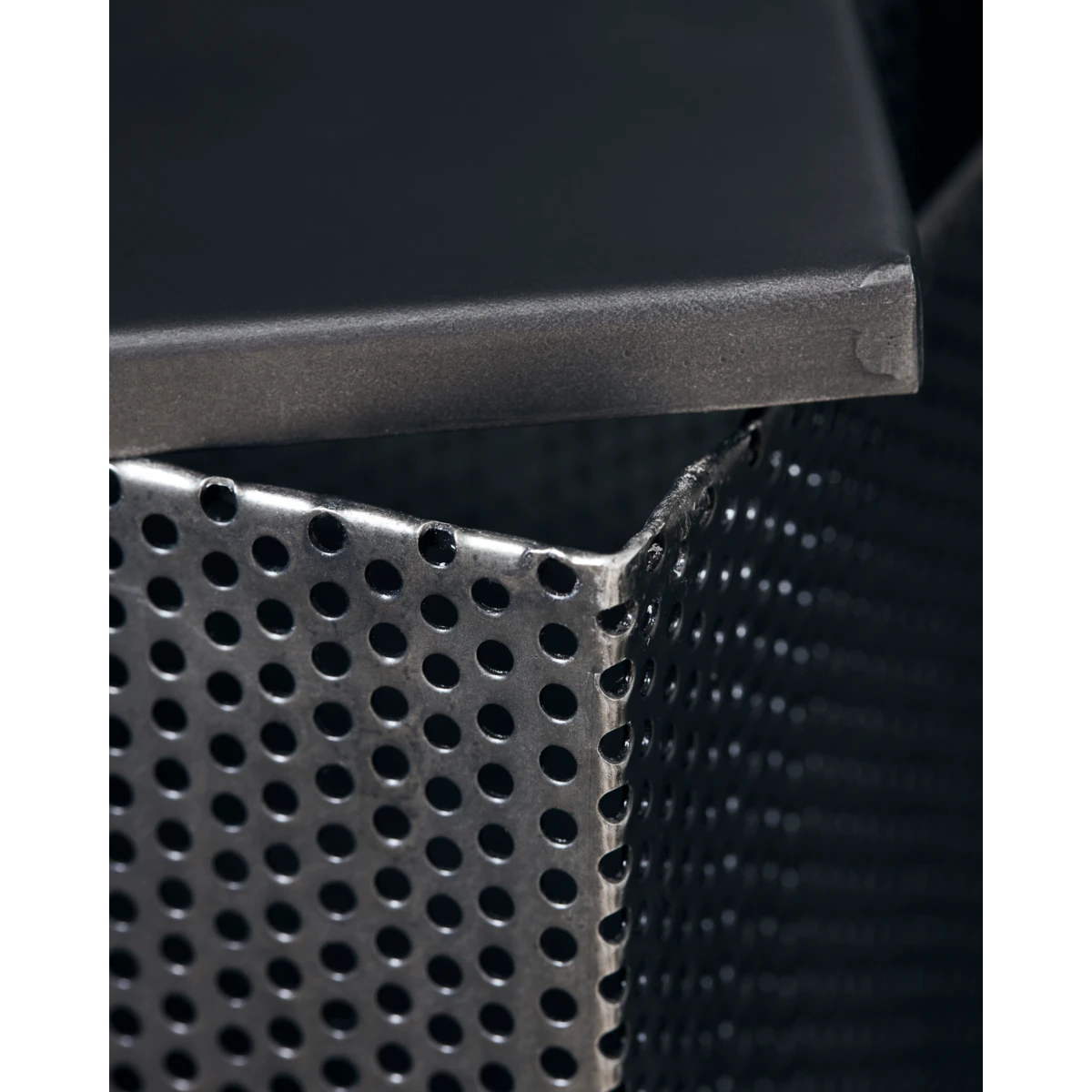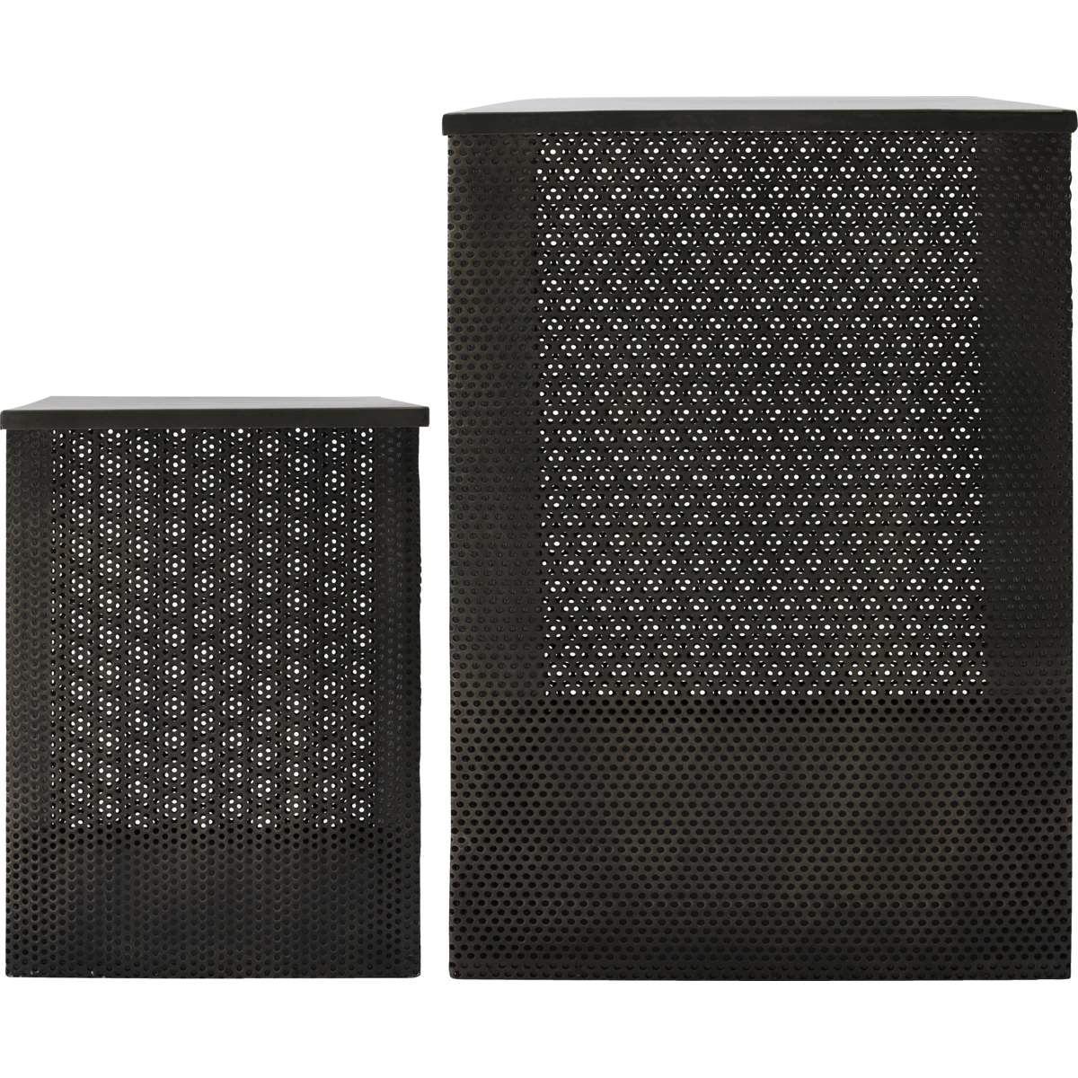 Dwie bryły – różnej wysokości, tej samej myśli – prezentują się z graficzną precyzją i industrialnym wdziękiem. Wykonane z perforowanej, ciemnej blachy, wyglądają jak nowoczesne rzeźby, w których światło i cień toczą subtelny dialog przez dziesiątki drobnych otworów. Ich geometryczna forma i rytmiczna perforacja nadają im architektoniczny charakter, jakby wyjęto je z przestrzeni galerii sztuki lub minimalistycznego loftu. Solidne, a jednocześnie lekkie wizualnie, mogą pełnić funkcję stolików pomocniczych, pojemników czy dekoracyjnych obiektów — w zależności od potrzeb i wyobraźni. To duet, który wprowadza do wnętrza porządek i rytm, balansując między funkcjonalnością a estetyką. Nowoczesne, surowe, ale niepozbawione duszy — jakby w ich strukturze kryła się historia współczesnego designu, zaklęta w stali i powietrzu.