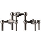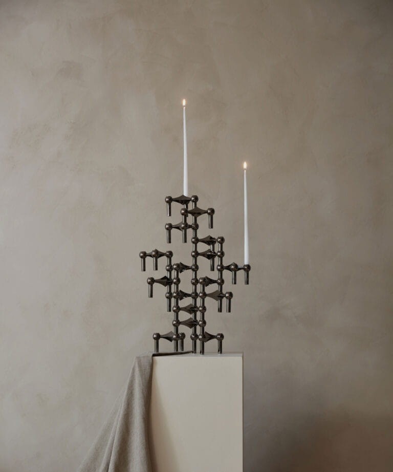 Wykończenie w odcieniu gunmetal nadaje świecznikom STOFF Nagel głęboki, antracytowy połysk i szlachetność. To propozycja dla tych, którzy szukają nowoczesnego, ale subtelnie luksusowego akcentu do swojego wnętrza. Ciemny chrom odbija światło w bardziej stonowany sposób niż klasyczny, lustrzany chrom – jest bardziej tajemniczy, nieoczywisty, a przez to niesamowicie wyrazisty. W tej wersji świeczniki tworzą elegancką i rzeźbiarską instalację, która świetnie prezentuje się zarówno solo, jak i z towarzyszącymi świecami stożkowymi. Kompozycja składa się z kilku połączonych modułów, co ukazuje pełnię możliwości konstrukcyjnych tej serii. To ukłon w stronę miłośników modułowego designu, gdzie funkcja spotyka się z formą, a użytkownik staje się współtwórcą kompozycji. Wykończenie gunmetal doskonale wpisuje się w aranżacje nowoczesne, loftowe, industrialne i high-end minimal, nadając im głębi, wyrafinowania i architektonicznej siły wyrazu.